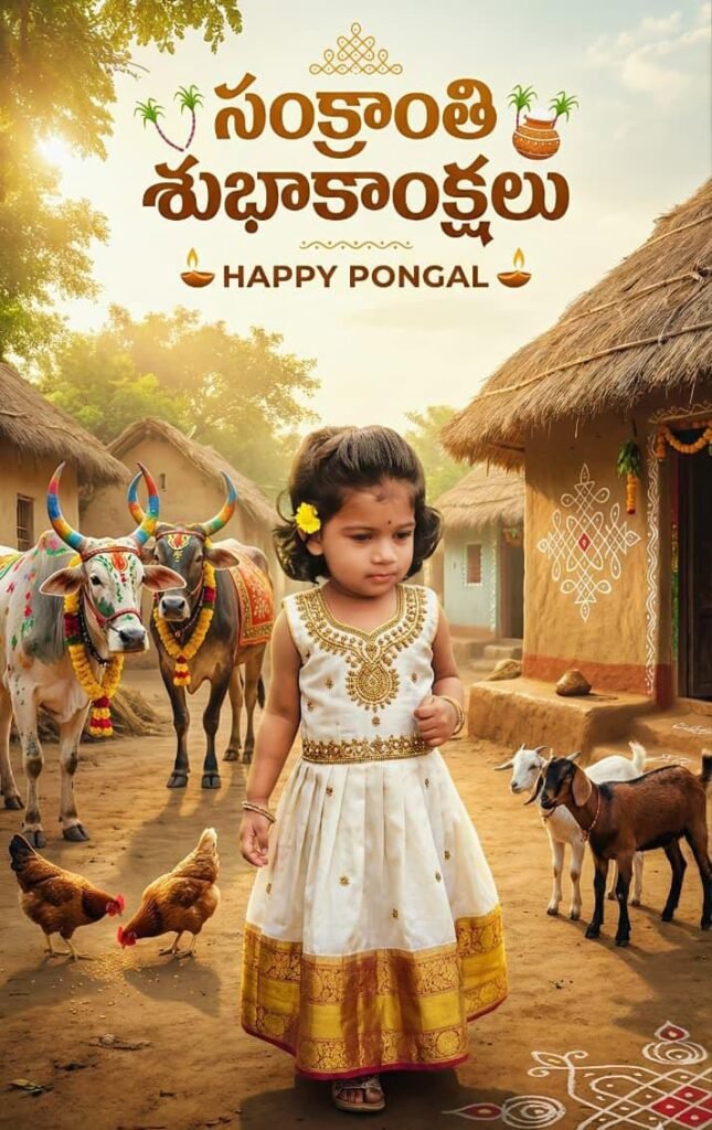 Create a fully cinematic South Indian style Pongal festival poster. Small girl She is wearing a white and gold bodderd combination half patu designer frock with lots of ambrodary work, festival theam ,She is walking in village street back ground having cows, hens ,gots natural village-style look., సంక్రాంతి శుభాకాంక్షలు
