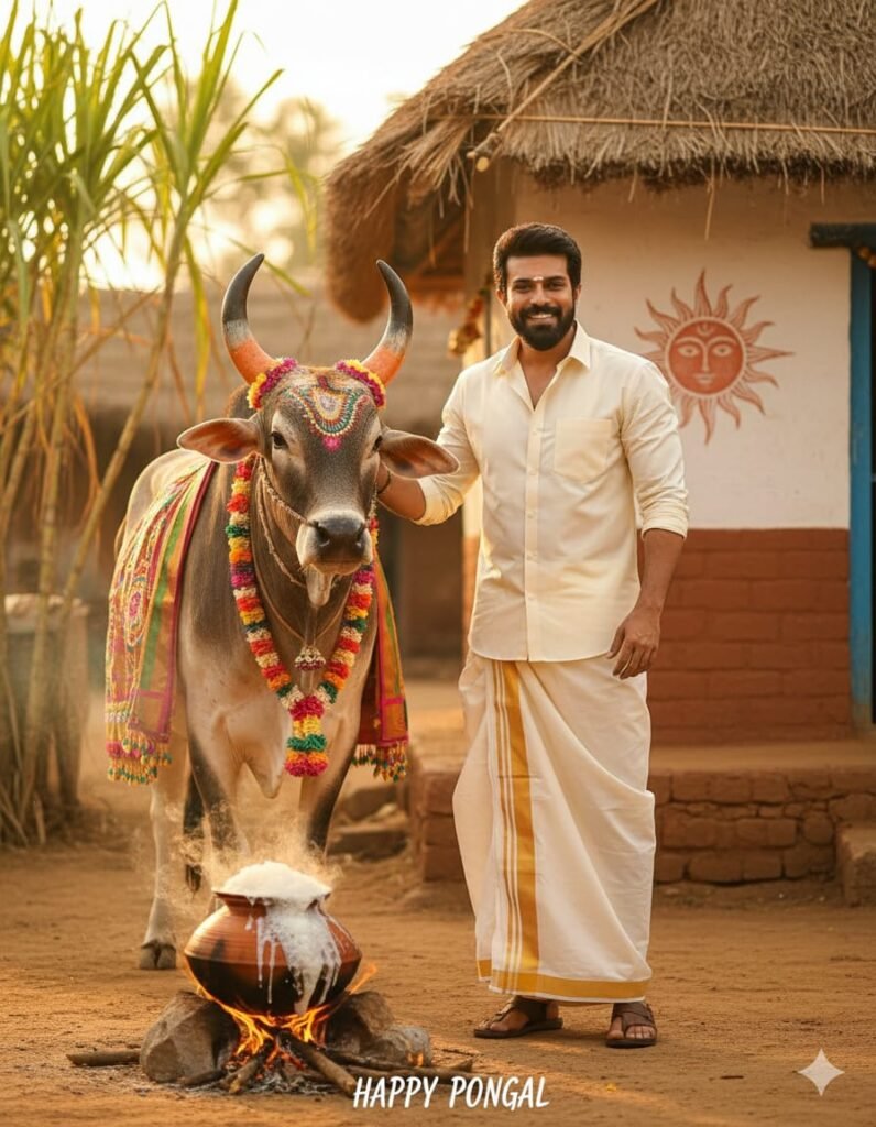 Warm golden lighting, cinematic photography: ( Dont change my Face ) HAPPY PONGAL.